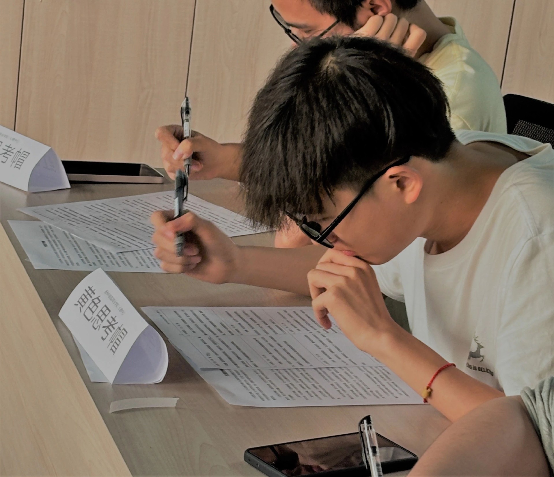 带好帽子以后,给每个同学发放了一个海难救援的案例,让同学们以帽子颜色的思维角度出发,对救援顺序进行排序,同学们站在自己的思维角度给出了自己的排序和排序理由,其中也不乏有同学偷带其他颜色帽子的情况。
