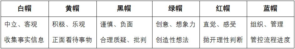 本次团辅活动随机分配了六顶思考帽给六位同学,同时选择两位同学作为裁判员。六位同学们通过佩戴不同颜色的思考帽,让不同的同学在同一时间只能选择一种思维角度,如逻辑、信息、创新、情感、风险、程序,裁判员负责监督各个同学在活动中是否偷戴了别人的帽子。