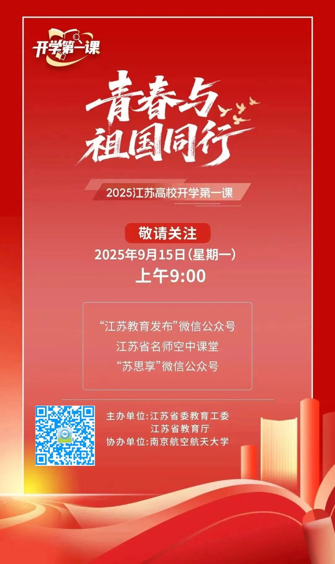 9月15日(星期一)上午9:00江苏教育发布开学第一课《青春与祖国同行》迎新直播欢迎广大师生、校友、家长锁定直播间,一起开启新学期的精彩序幕!观看方式长按上方二维码,···