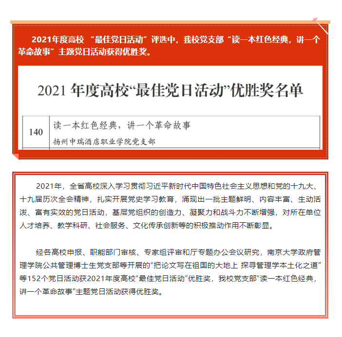 2021年度高校 “最佳党日活动”评选中,我校党支部“读一本红色经典,讲一个革命故事”主题党日活动获得优胜奖。