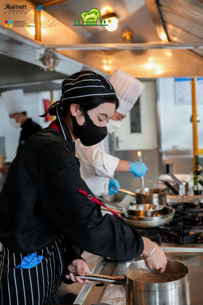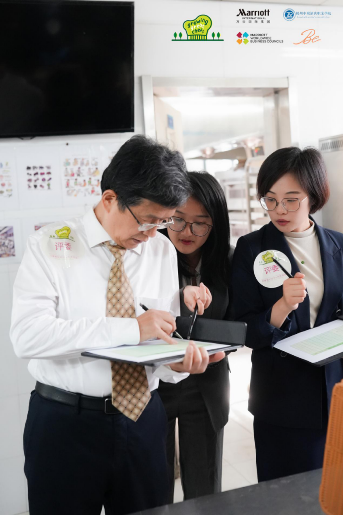 由万豪集团8位酒店高层和我校5位指导老师组成专业评审团,在比赛过程中,评委走动观察各队伍烹饪情况。
