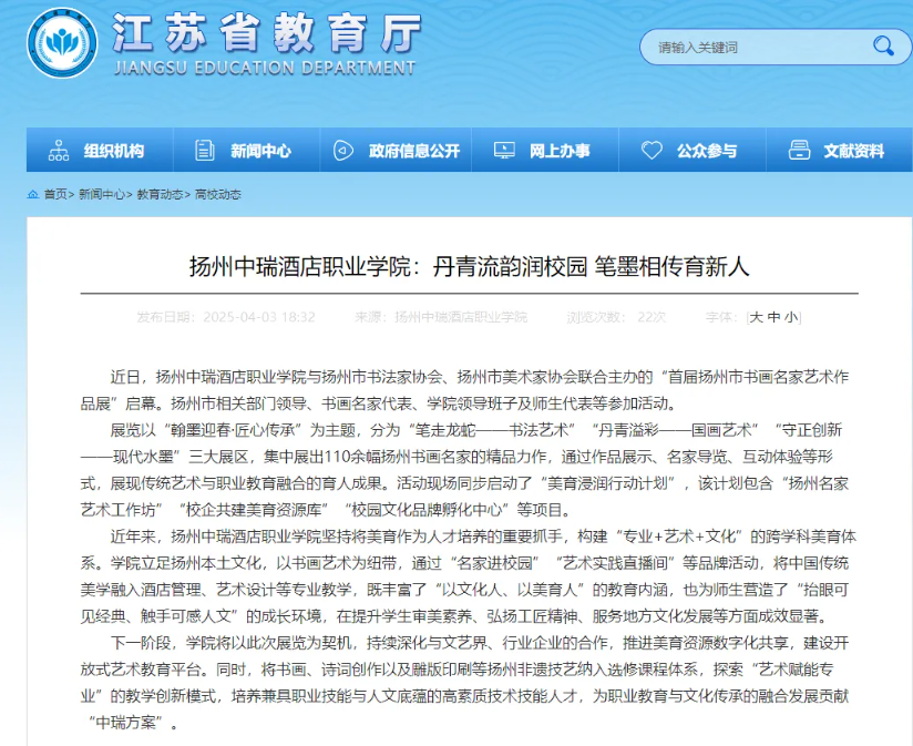 近日,江苏省教育厅官网在《高校动态》中报道了"扬州中瑞酒店职业学院首届扬州市书画名家艺术作品展",这是对我校校园文化建设和美育教学工作的充分肯定与激励鞭···