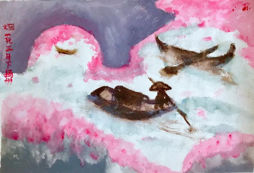 作品说明:水的雾气与花的飘落融为一体,水天一色,渔夫将船桨划入了水中,起了阵阵涟漪。烟雾弥漫在舟身,似一幅世外桃源。意在画咏扬州:三月的扬州,盛世的美。