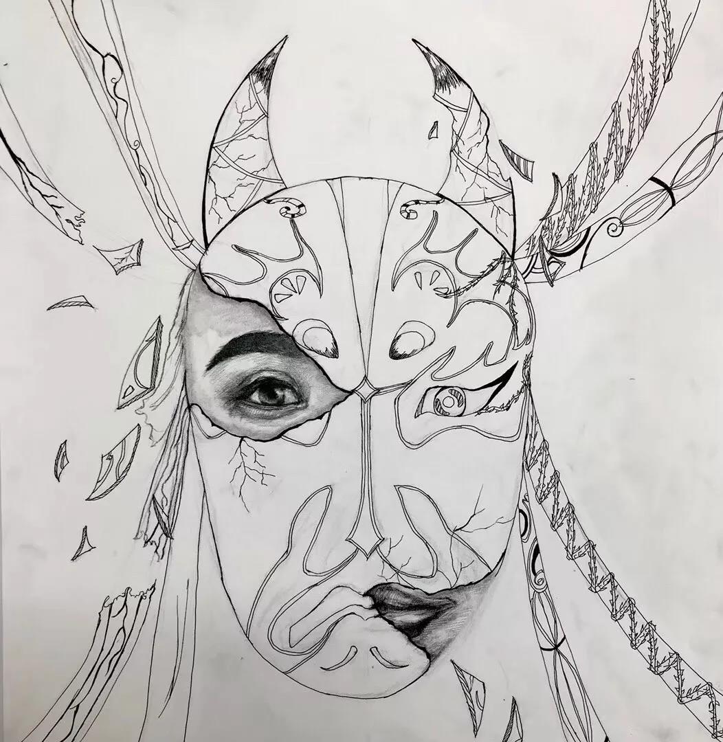 作品说明:面具、帷幔、荆棘都束缚着人的本性,把人包裹成冷漠无情的样子,而面具下面都有柔软的地方。面具和帷幔的破裂代表了人渴望突破自我,碎裂的犄角代表了人放弃尖锐 ,取代而至是柔软。展现的是面具背后人性的另一面。