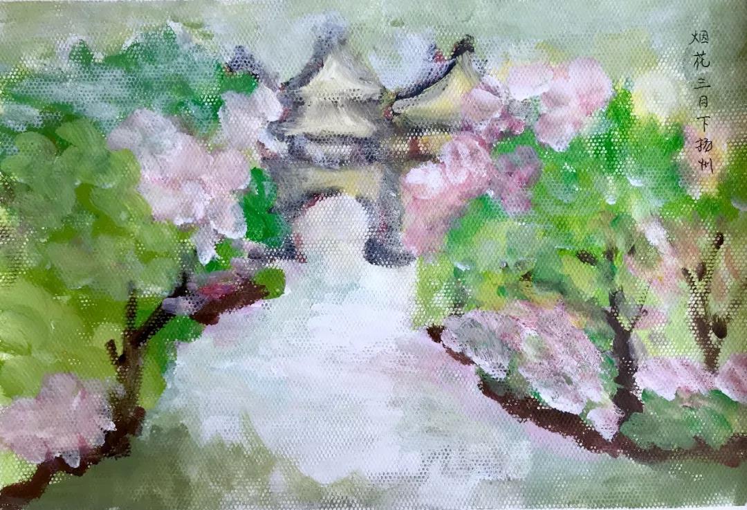 作品说明:水的雾气与花的飘落融为一体,水天一色,渔夫将船桨划入了水中,起了阵阵涟漪。烟雾弥漫在舟身,似一幅世外桃源。意在画咏扬州:三月的扬州,盛世的美。