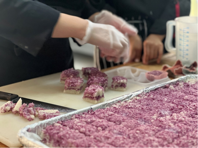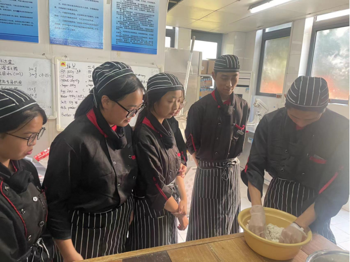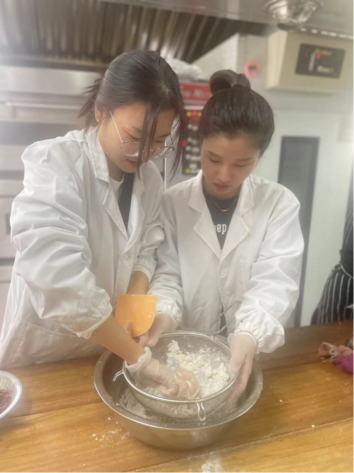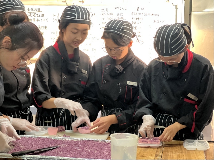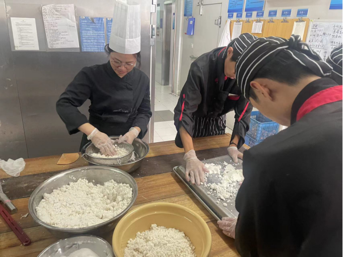 今天下午,活动在中瑞酒店学院实训饼房内拉开序幕。糕点制作前,指导老师田野惠子先与同学们分享了重阳糕的由来以及制作方法。随后在老师的指导下,同学们按照步骤开始热火朝天地忙活起来。