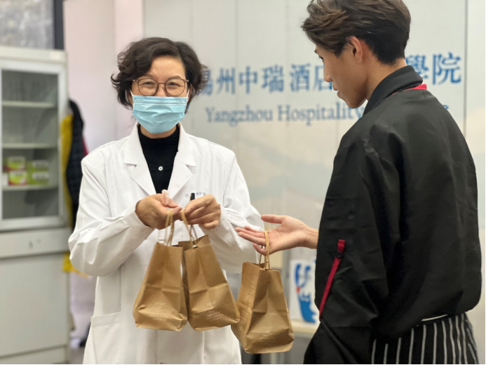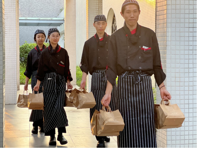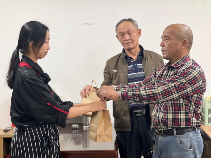 经过一个多小时的精心制作,一份份饱含心意和祝福的重阳糕新鲜出炉。随后,在人事处老师们的带领下,学生们将打包好的糕点送至坚守在岗位上的教师们,老师们接过糕点,充满了惊喜和感动,并表示感谢。
