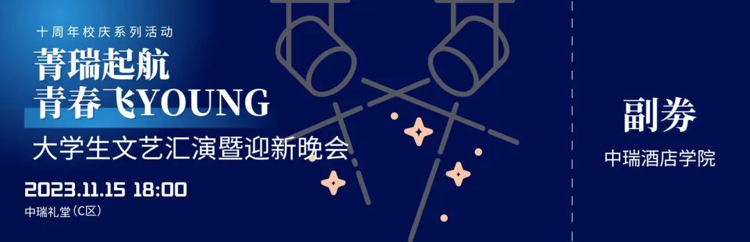 相约中瑞,为梦前行,来自全国各地的学子们相聚在扬州中瑞酒店职业学院,为学校带来欢声笑语。我们用心欢迎,倾心策划,在这个充满活力的十一月,2023年“菁瑞起航,青春飞YOUNG”大学生文艺汇演暨迎新晚会整装待发!