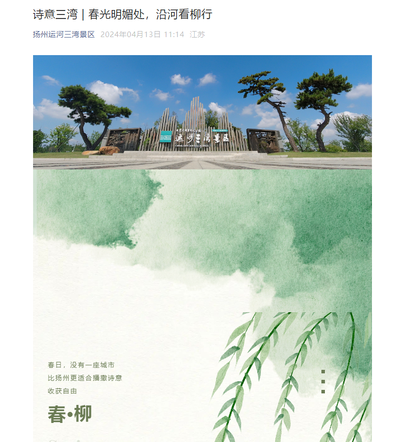 同时,这也是我校第二次有学生参与的诵读作品登上扬州运河三湾景区的官方账号,今年4月,我校酒管2304班陈微冰同学诵读的文章《诗意三湾 | 春光明媚处,沿河看柳行》同样引起了广大游客和市民的热烈反响。她的诵读,不仅展现了运河三湾在春日里的勃勃生机,更传递出对自然之美的深深热爱与向往。